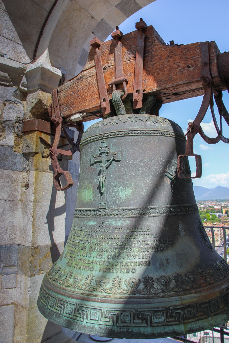 Ce dernier étage est également l’étage où se trouvent les cloches. Je ne l’ai pas précisé jusqu’ici, mais la tour de Pise est le campanile de la cathédrale située à côté. A savoir, par définition, la tour qui abrite les cloches servant à appeler les fidèles à la prière !