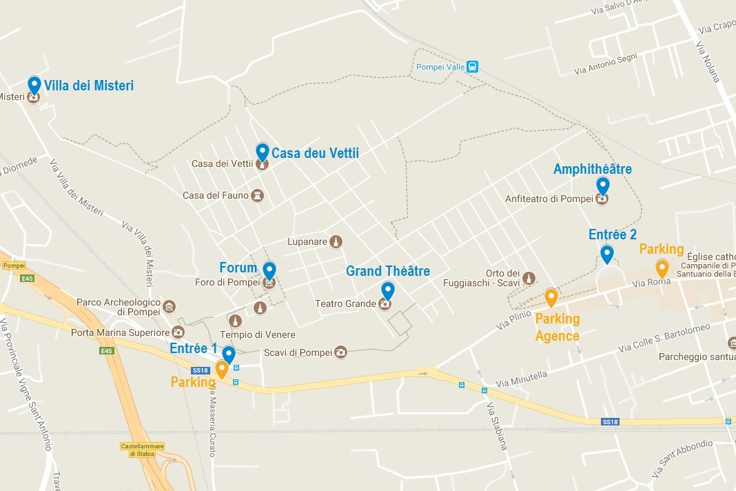Dans mon cas, après avoir tourné un peu, je me suis rabattu sur le parking d’une agence de tourisme, appelée « Pompéi service ». Ils ont pignon sur rue dans différentes agences indiquées « Tourist office ». Le prix est de 20 € en tout pour le parking à la journée, un plan du site, un guide papier en français (un vrai livre d’une centaine de pages, et illustré), et un DVD (que je ne regarderai sûrement jamais j’avoue…).